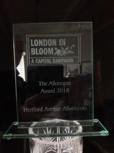 At the beginning of November at the annual Allotment prize giving at the Town Hall, Derek Lawrence-Brown and John Padgett received the London in Bloom Allotment Award on behalf of the Hertford Avenue plot holders.