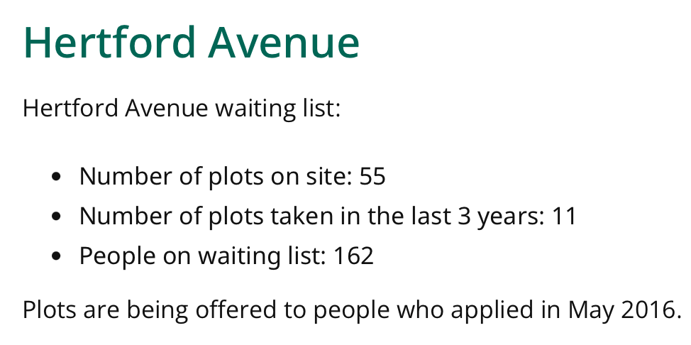 The council prepared a spreadsheet of the waitlist as of August 2019. This shows the number of plots on each site, the number of new plot holders starting over the past three years, the date of application for the next person to be contacted when a plot is available, and the total number of applicants waiting for each site.