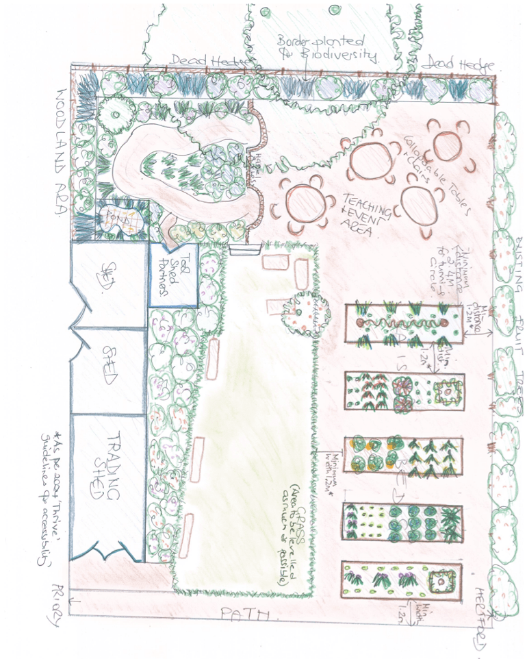 - Accessibility: has this been fully addressed? – The plan has been updated to adopt the ‘THRIVE’ guidelines for path width and turning circles and including space for temporary seating in bed area.