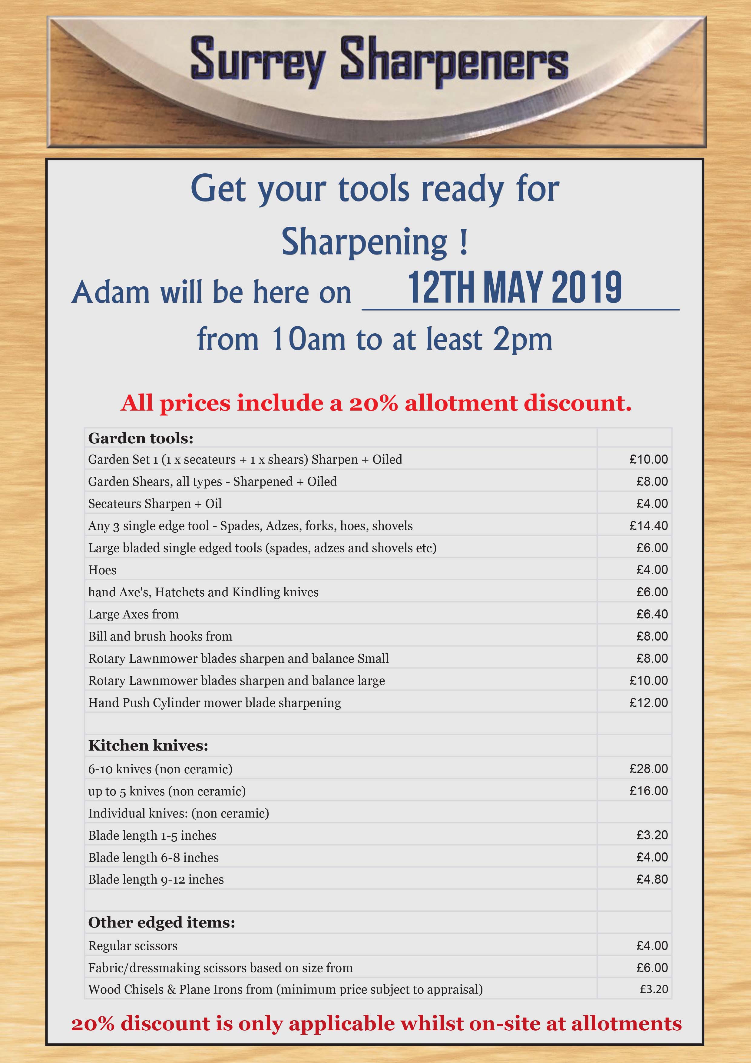 We are pleased to announce that at the Open Day this year Adam Bennett will be offering his tool sharpening services at a discounted rate (for plot holders and members of the general public). Bring your gardening tools, kitchen scissors and lawnmowers to get them in tip top condition for the new growing season. For a full price list click on this link.